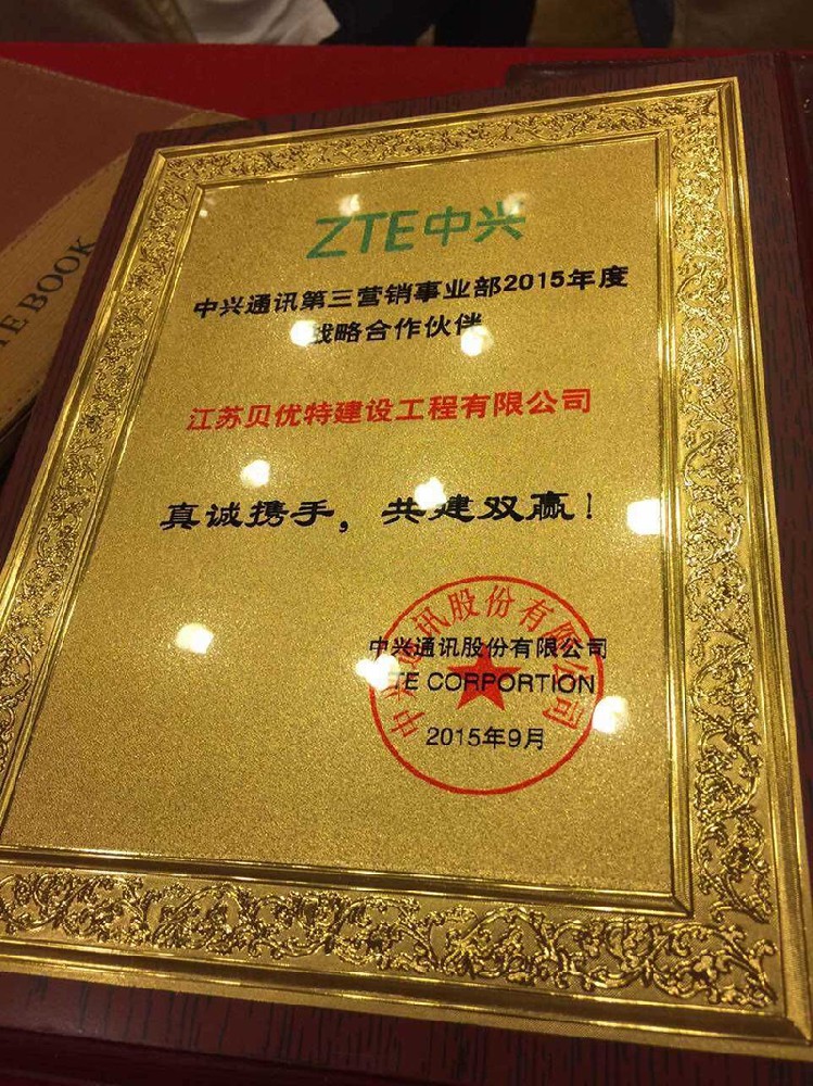 2015年9月10日,我們江蘇貝優(yōu)特建設(shè)有限公司榮獲ZTE中興特殊貢獻(xiàn)獎,作為中興通信的戰(zhàn)略合作伙伴,貝優(yōu)特人一直在努力構(gòu)建雙贏合作的發(fā)展,總經(jīng)理陳波,中興通訊負(fù)責(zé)人鄭鈞總經(jīng)理在本次商討合作會中上臺領(lǐng)獎,并分享心得。